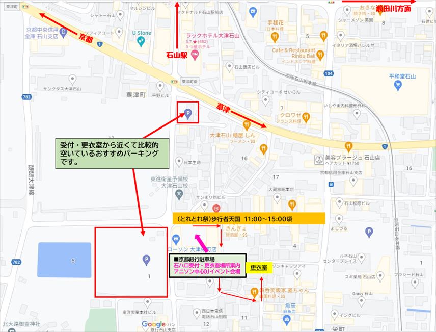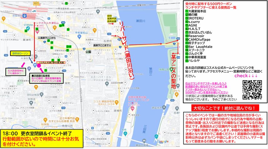 JR石山駅&京阪石山駅から徒歩5分くらいでアクセスも良好!そしてこの街は某アニメの聖地でもあり、あの場所であのキャラで撮影するのもいいかもー。カラオケや飲食店も多い街なのでアフターもバッチリデス!!提携店で使える金券500円を使ってアフターもいいですね!皆様のご参加スタッフ一同心よりお待ちしております! |