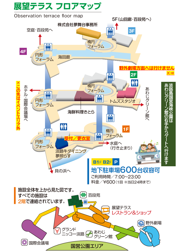 お車でお越しの方⇒施設地下に1回600円の有料パーキングがございます。駐車場から受付場所(夢舞台 展望テラス1F)は直結しております。